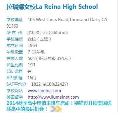 拉瑞娜女中La Reina High School坐落在加州文图拉县的千橡市,人口12万5千,距离加州洛杉矶市中心45分钟车程。千橡市有很多特色:治安良好(连续多年都是美国最安全的大城市之一);城内布满了橡树(城市因此而得名);生活富裕(2006年被美国财经杂志评选为全美10大最适宜居住城市之一);环境优美,气候温和(年平均气温在摄氏10--20度之间)。