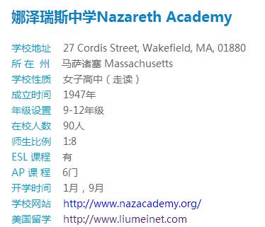 娜泽瑞斯中学于1947年建于麻省Wakefield市,地理位置优越,距离波士顿10-15分钟车程,使在校国际学生可以很容易领受波士顿这座世界级文化、教育之都的绚丽生活气息。