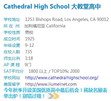 大教堂高中Cathedral High School 学校建于 1925 年,位于加州洛杉矶,是洛杉矶的一所男校,学校 提供 9-12 年级的课程。学校的教学宗旨是育人、传播宗教学以及常规学术课程,学校尤其 照顾那些来自加州洛杉矶经济贫困的学生。学校的办学目的是把学生培养成这样的人才: