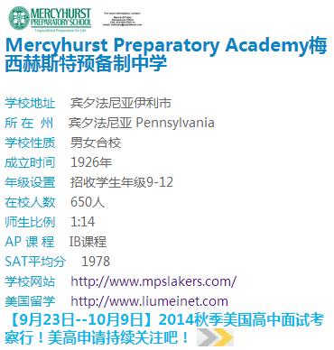 梅西赫斯特预备学校成立于1926年,是一所四年制的天主教私立中学,由慈善修女会创办。作为西北宾夕法尼亚州唯一的国际文凭学校(9-12年级),学校具有良好的师资以及培养出众多的优秀毕业生。是美国最好的高中之一。并曾两次荣获美国教育部授予的蓝带优秀学校奖 (蓝带优秀学校奖是美国学校的最高成就奖 )。SAT平均成绩达到1892分,拥有美国高中前 1% 的平均SAT成绩。很多老师曾在大学任职,学校10年级到12年级学生也能在附近的梅西赫斯特学院修大学学分,梅西赫斯特的大学录取率为100%,许多毕业生被美国顶尖大学录取,学校国际生比例15%。