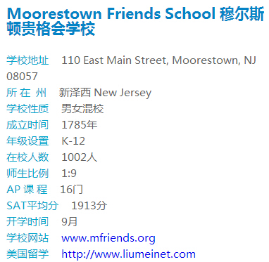 穆尔斯顿贵格会学校是新泽西南部顶级学校,SAT平均分高出全国平均400多分,众多学生升入美国顶级名校。