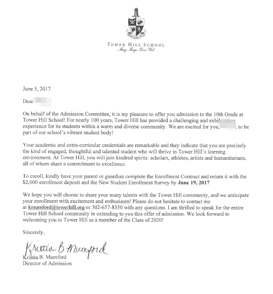恭喜Z同学成功补录到顶尖走读高中Tower Hill School!