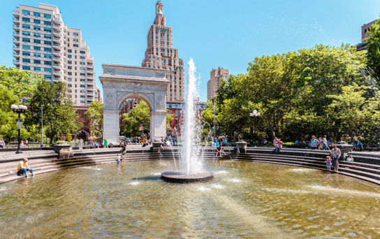 纽约是世界名城,曼哈顿是纽约的精华所在。华尔街,联合国总部,自由女神像,大都会博物馆,时代广场,中央公园,第五大道,洛克菲勒中心,百老汇剧院区,唐人街均云集于此。市内近300家剧场电影院及200家图书馆及著名的哥伦比亚大学,朱利亚音乐学院等学府争相辉映。纽大位于市中心的华盛顿广场与格林尼治村,是全球艺术交流互动的重镇之一。只要从紫罗兰/白色有山猫吉祥物的校旗上就能分辨出纽大的校区。华盛顿广场,格林尼治村曾是马克·吐温(Mark Twain),爱伦·坡(Edgar Allan Poe)等著名作家和诗人的居住处,而附近的人文景色都被生动地描绘于他们的作品之中。纽约大学的教授和学生12500人被安排在广场附近的21幢宿舍中居住,学生可乘坐大学的巴士到校园就读。
