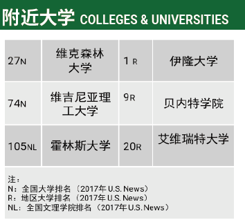 1、学校位于弗吉尼亚中部的夏洛茨维地区,距离美国首都华盛顿100多英里,约两个小时车程;夏洛茨维是独立宣言起草人Thomas Jefferson 的家乡,也是附近最大制造业的集中地。