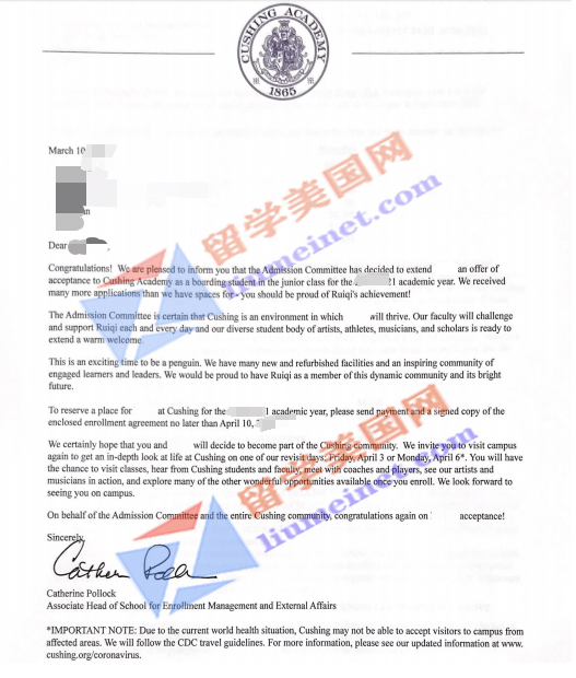 库欣学院(Cushing Academy)创⽴于1865年,是美国历史最悠久男⼥合校寄宿中学之⼀,也是⼀所具有创新⾃主精神的⼤学预备制⾼中。学校距离波⼠顿仅需1⼩时车程,⼩镇景⾊优美,有湖泊,河流,还有滑雪的地⽅。除了注重理论知识的学习,学校更希望能培养学⽣的综合素质,包括独⽴能⼒、交际能⼒、实践能⼒、领导能⼒、团队合作精神和组织能⼒等等。
