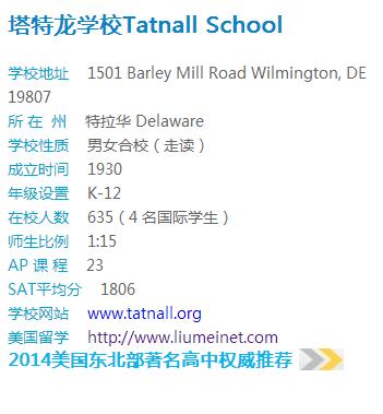 塔特龙学校Tatnall School教学卓越,具有很高的常青藤学校入学率,录取的学校有哈佛大学、耶鲁大学、布朗大学、西北大学、普林斯顿大学、斯坦福大学、康奈尔大学,宾夕法尼亚大学、芝加哥大学等。