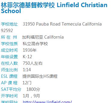 林菲尔德基督教学校Linfield Christian School 前身为卡尔特博士于1936年所建立的卡尔特学院。当时的卡尔特博士是洛杉矶女子圣经学院的院长,她看见了人们对于小学和中学基础性教育的需求。因此,她渴望给予年轻人在体格、智力、情绪和精神等各个领域以指导和挑战,而建立了卡尔特学院。1968年,学校迁至现在的校址,并更名为林菲尔德学校。到2001年11月,董事会才将学校更名为林菲尔德基督教学校。本校是一所私立学校,为幼儿园至十二年级的年轻学子提供教育服务。位于郊区的校园临近圣地亚哥,占地105英亩,有6所建筑,是由NAIS,加利福尼亚教育部批准的私立学校。