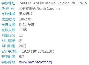 瑞文斯克罗夫特中学创立于 1862 年,是一所拥有 150 年的悠久历史的名 校。校园面积广阔,占地 125 英亩。该 校地理位置极佳,位于美国北卡罗兰纳 州首府 Raleigh。该校为北卡罗来纳州 顶级名校高中,全美著名高中。150 年历史,蓝带学校,学风严谨,充满 学术气息和多元化教育的优质学校 。