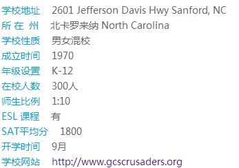 格瑞斯基督学校位于北卡州的桑福德,建于1970年,提供K-12年级的课程。95%的学生都能进入心仪的大学深造。学校以基督教为背景,旨在培养学生的品德、推理能力、学术技巧和身心健康。格瑞斯基督学校的课程以圣经为核心,所有的老师都是基督徒并且持有各种证书,同时具有多年的教学经验。学校离杜克大学和北卡大学教堂山分校都很近,学校时常组织学生去这两个学校咨询如何申请。