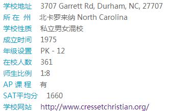 Cresset Christian Academy 成立于1975 年,是一所私立的基督学校,学校实行男女合校。学校开设大学预科课程、运动项目和艺术课程。学校是浸信会教友会的一员,并同教友会共同使用设施。学校致力于学生道德修养、自律能力、领导能力的提高,并培养学生养成良好的学习习惯,提供学生的计算机技能,教会学生用批判性思维看问题,培养学生良好的世界观。