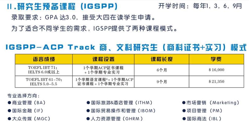 适合目标申请南加州大学本科、硕士,满足学术要求,但语言能力稍有欠佳的学生。其中硕士预科最为吸引人,可让学生立即获得享受南加大教育的机会。本科预备课程要求学生拥有高中毕业证书。硕士预科要求托福不低于61~75分(视专业而定),本科期间GPA3.0以上,不需GRE或GMAT成绩