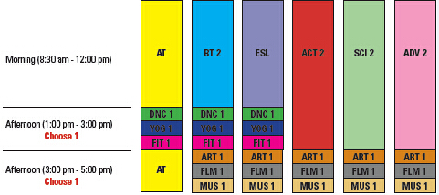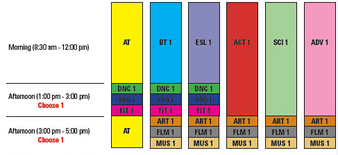 AT:学术课程 BT:商务课程 ESL:语言课程 ACT:表演课程 SCI:科学课程 ADV:冒险课程 DNC:跳舞 YOG:瑜伽 FIT:健身 ART;艺术 FLM:电影/摄影 MUS;音乐