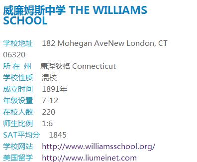 The Williams School 威廉姆斯中学有99%的学生毕业后进入大学继续深造,包括哈佛大学、杜克大学、约翰霍普金斯大学、波士顿学院、波士顿大学、哥仑比亚大学、乔治华盛顿大学、芝加哥大学等