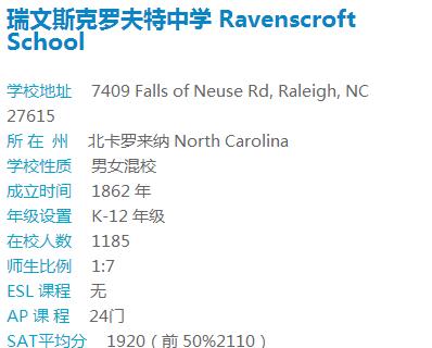瑞文斯克罗夫特中学创立于 1862 年,是一所拥有 150 年的悠久历史的名 校。校园面积广阔,占地 125 英亩。该 校地理位置极佳,位于美国北卡罗兰纳 州首府 Raleigh。该校为北卡罗来纳州 顶级名校高中,全美著名高中。150 年历史,蓝带学校,学风严谨,充满 学术气息和多元化教育的优质学校 。
