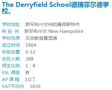 德瑞菲尔德学校The Derryfield School是一所提供6-12 年级教育,私立男女合校性质的学校。学校位于美国新罕布什尔州的曼切斯特市,靠近波士顿,占地84 英亩。学校致力于为学生提供先进的教学设施及教学理念,鼓励学生设定目标、发展个性、尽最大努力去实现自己的目标。学校为学生提供现代化的教学设备,采用IPAD 教学,课堂全面信息化。