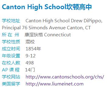 坎顿高中坐落在康涅狄格州风景优美的富裕小镇坎顿。坎顿是一个交通方便、安全、适于居住的地方。坎顿高中是一所小型优质高中,学校被US News & World Report授予金奖,2013年被评为美国最好的学校之一。爵士乐团在2015年波士顿举行的Berklee High School Jazz Festival中获得最高荣誉,在UMASS Jazz Festival中被7次选为最好的爵士乐团。