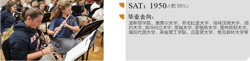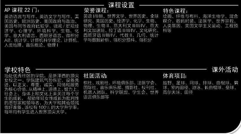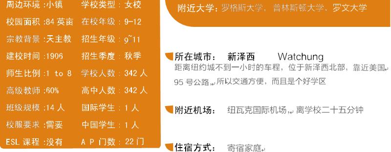地处优秀社区的学院,是新泽西的顶尖 女校之一。学院建筑气势恢宏,设备先 进,以正义,尊重,诚实,同情和服务 为核心价值,从精神上、道德上、智力上、 社会上、身体上和文化上来关注每个学 生的成长,帮助年轻女性成长为批判性 的思想家和领导者,为大学和其他领域 做好准备。该校有100%的大学升学率, 每年均有学生进入世界顶尖大学。