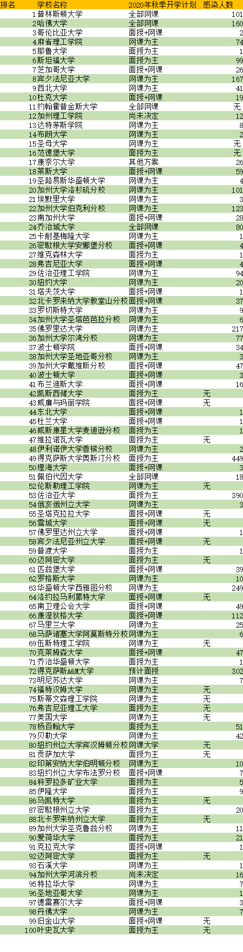 TOP100美国大学开学方式及感染人数
