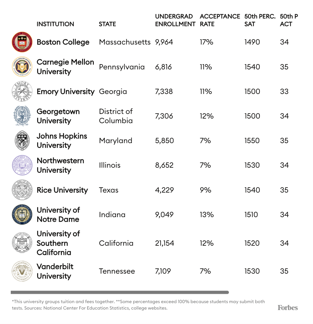 大学需拥有至少4000名学生;在2022Fall入学招生中拥有较高的标化(本次选出的高校SAT均分为1482,ACT均分为33);私立大学录取率低于20%,公立大学录取率低于50%;综合雇主调查与反馈。