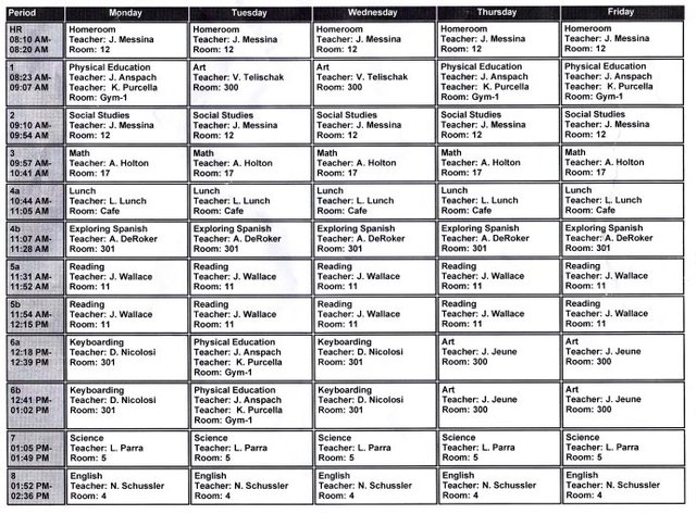 从8点23分起上第一节课,每节课45分钟。中间只有3分钟间隙,只够学生换教室用。请看上一张图片,那是孩子的课表,以周一为例,第一节体育课,第二节是社会科学,第三节是数学课。6年级学生在第四节课吃午饭,午饭用半节课时间,另外半节课是外语。外语课每天只有21分钟。第五节课是阅读,第六节课是打字/计算机,第七节课是科学,第八节课是英语(语文)。