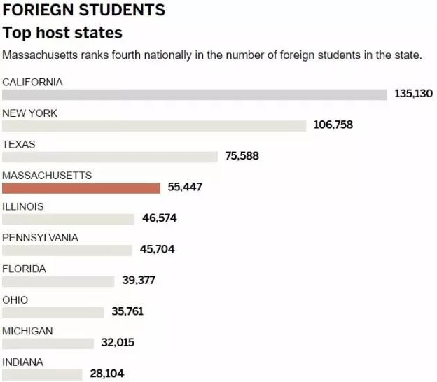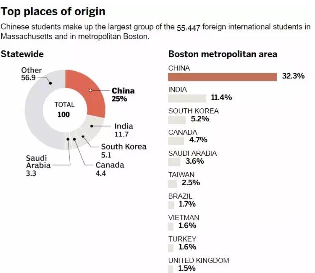马萨诸塞州的留学生们有25%,共55447人来自中国,印度人紧随其后,占11%,再加上韩国,加拿大,沙特这些国家来的学生,总共为该州贡献了约22亿美元的GDP。