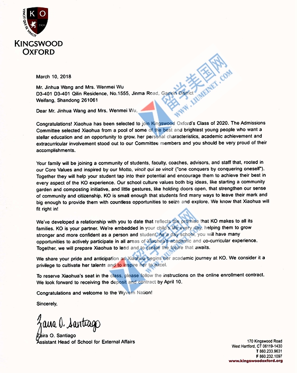 王同学申请学校的时候已经很晚了,临近截止时期,但是通过学生和文案老师的一起努力,互相配合,在短时间内成功递交申请,并成功地被第一志愿金斯伍德牛津中学录取。