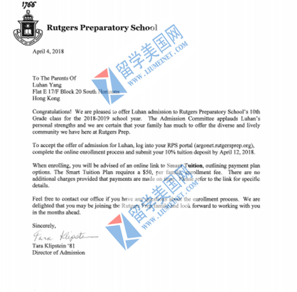 该同学体育成绩相对有些薄弱,但是通过自己的努力也一直有在克服困难慢慢取得进步。在申请的过程中,和文案老师配合非常默契,抽课间或者晚上的时间来完成一些文书。文案老师在面试培训中对有些问题的答案给予了积极指导。通过各位老师和学生的共同努力,杨同学成功地被罗格斯中学录取。恭喜杨同学!