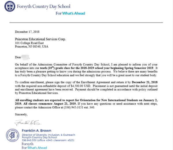 谭同学找到我们的时候是要申请春季的学校,时间和名额都是非常紧张的,而且标化成绩不是很好。虽然在进行面试培训的时候,发现谭同学在回答问题上有一些问题,但是经过文案老师的指导,在面试过程中谭同学成功地表现出了她的长处。但是在家长,学生以及留美网顾问和文案老师积极配合下,在很短的时间内就拿到了Forsyth Country Day School。