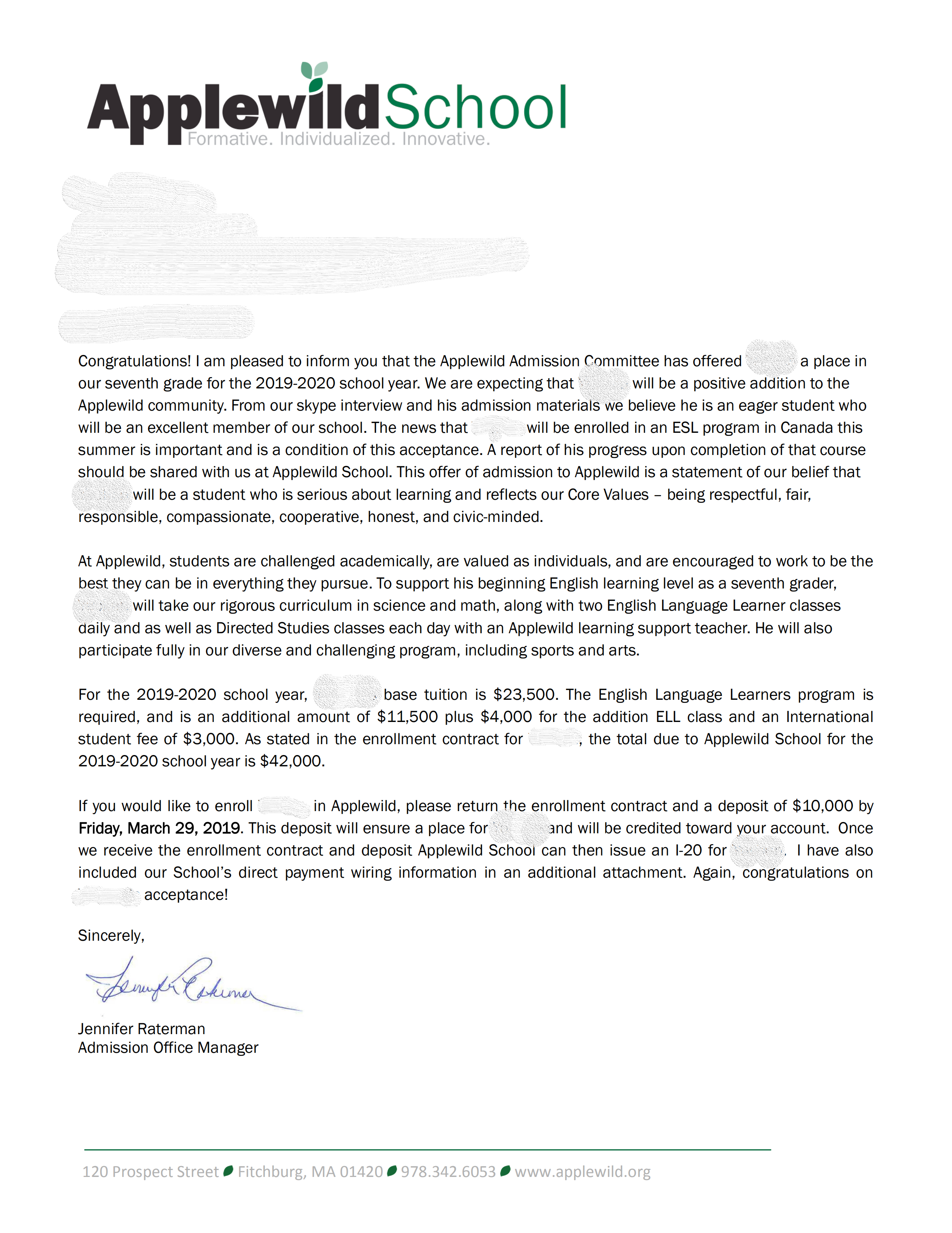 恭喜L同学收获苹果园中学录取Applewild School Offer