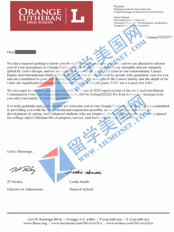 喜留学美国网Z同学获得橘郡路德高中(Orange Lutheran High Schooloffer)录取0ffer,祝愿他在未来的新的学校生活里快乐成长。