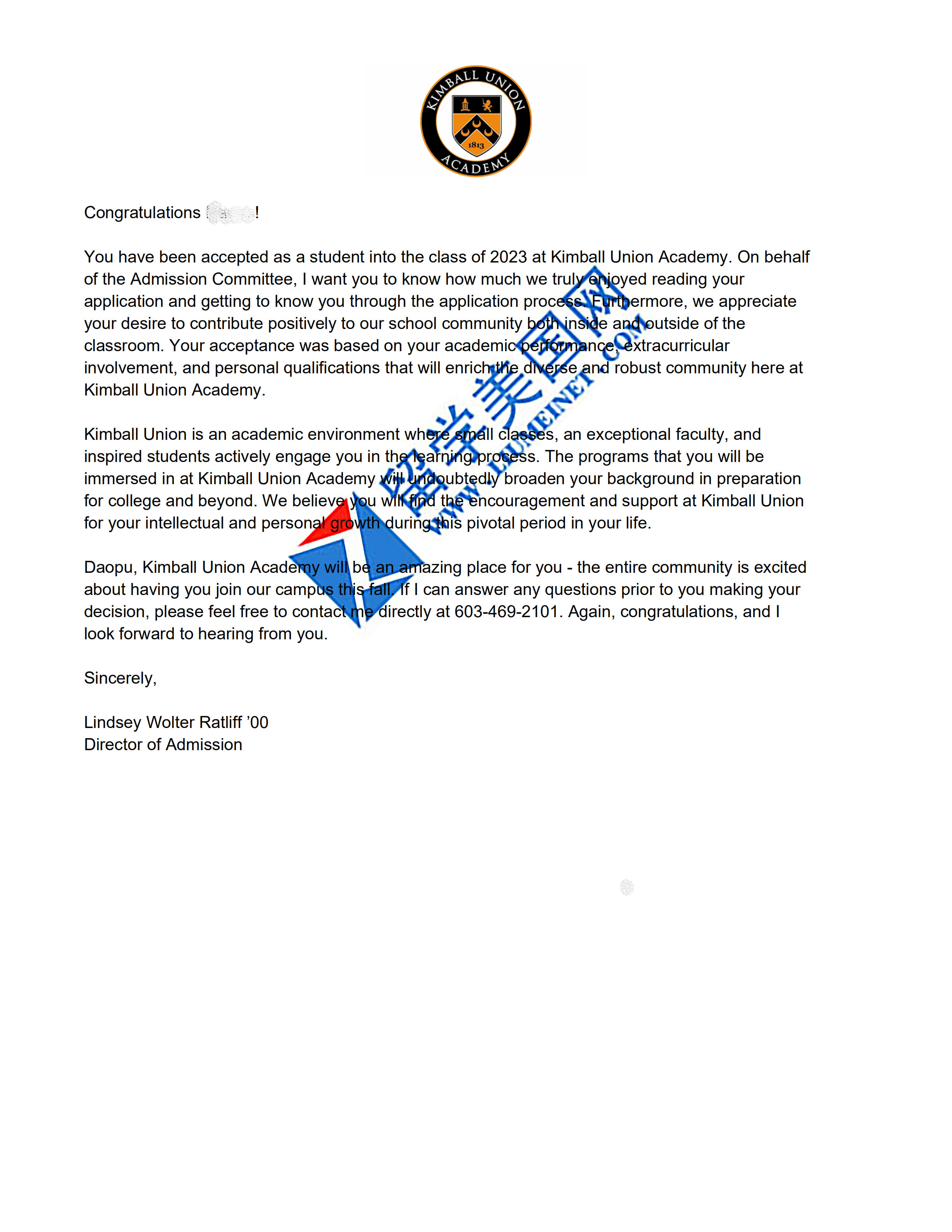 恭喜Z同学被金博联合学院录取