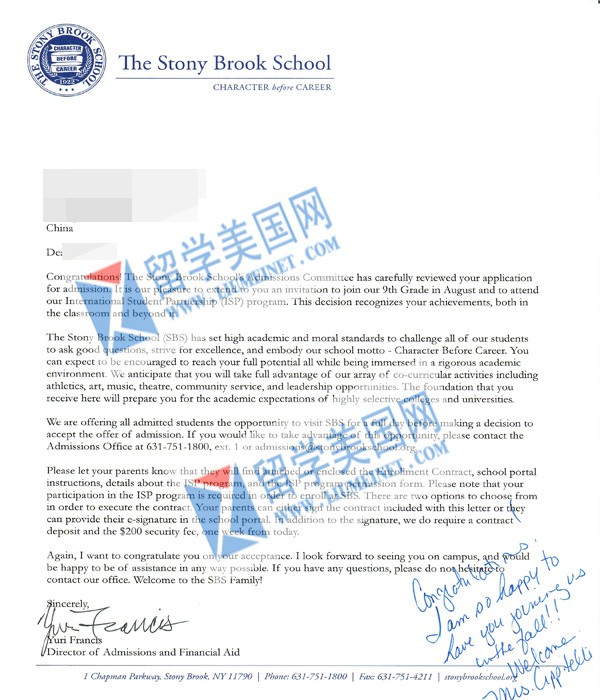 恭喜张同学被石溪学校录取,希望张同学在美国的学习和生活一切顺利!