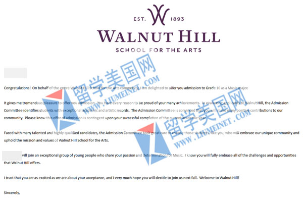留美网L同学被胡桃山艺术高中学校Walnut Hill School录取offer展示