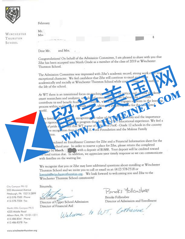 录取学校: 温彻斯特瑟斯顿中学Winchester Thurston School