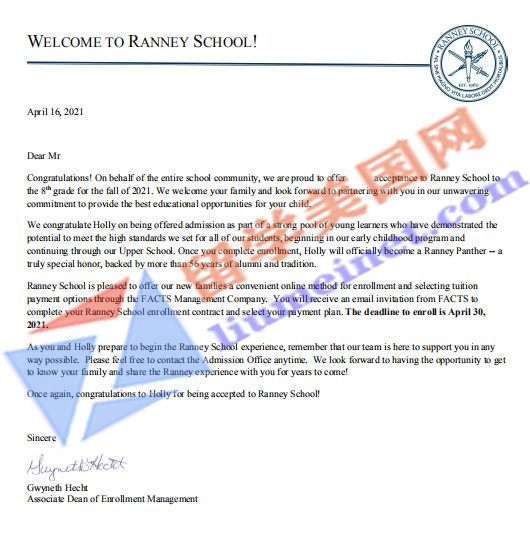 恭喜留美网Holly同学成功补录到美国顶尖走读中学兰尼学校Ranney School