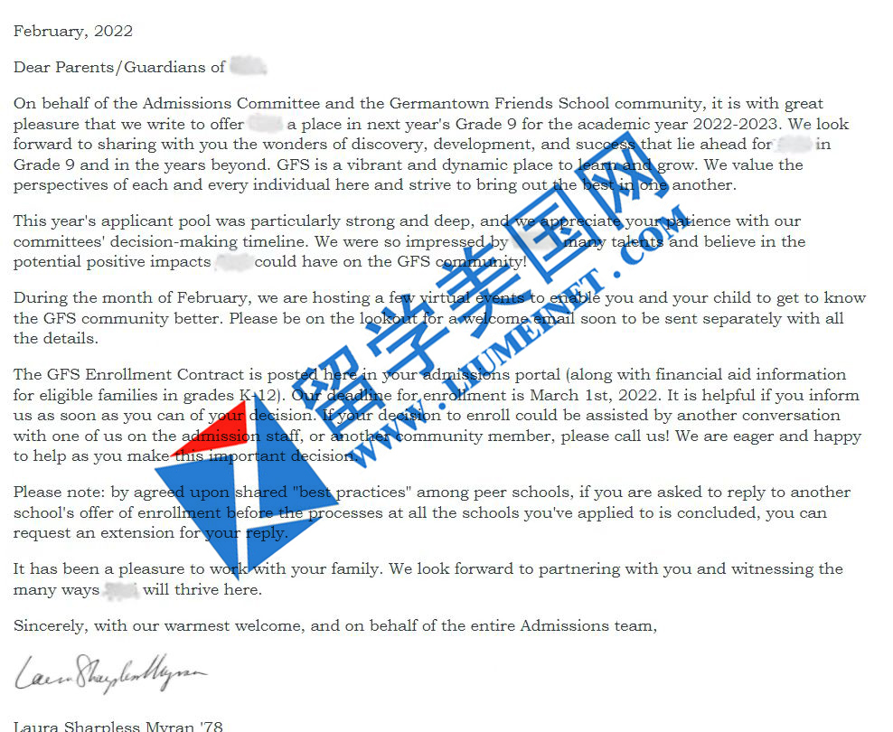 恭喜S同学能够顺利取得杰曼镇朋友学校的录取!Germantown Friends School是宾夕法尼亚州排名第一的私立高中,除提供完整且严谨的课程外还有丰富的表演艺术课程。这所学校与许多知名大学都拥有良好的关系,其毕业生许多升入美国名牌大学。常春藤名校的录取率甚至一度达到20%,进入这样一所优秀学校对于未来申请美本具有很好的优势。再次恭喜S同学得偿所愿收获Germantown Friends School录取!