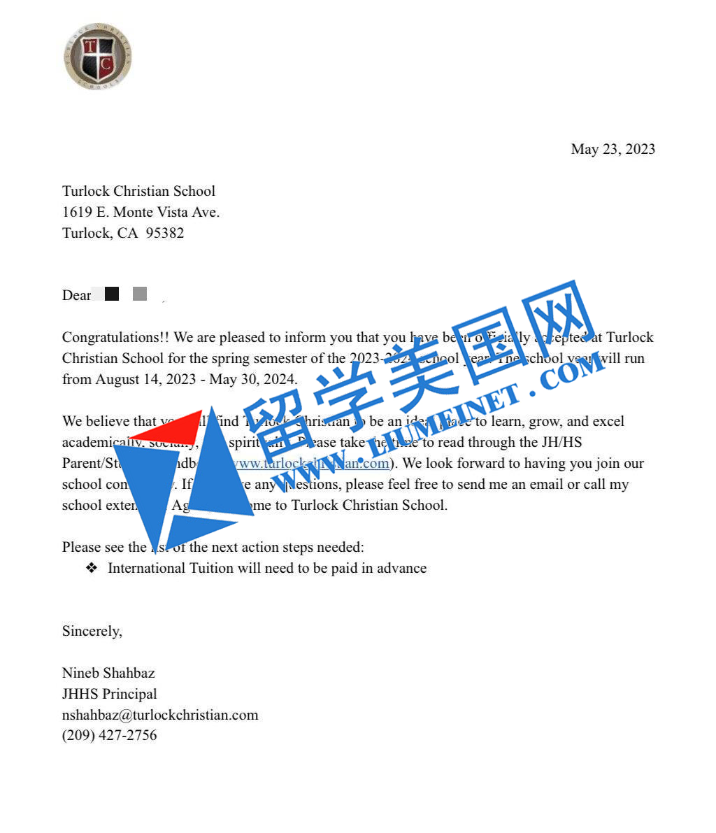 恭喜留美网Z同学斩获特洛克基督教学校(Turlock Christian School)录取offer
