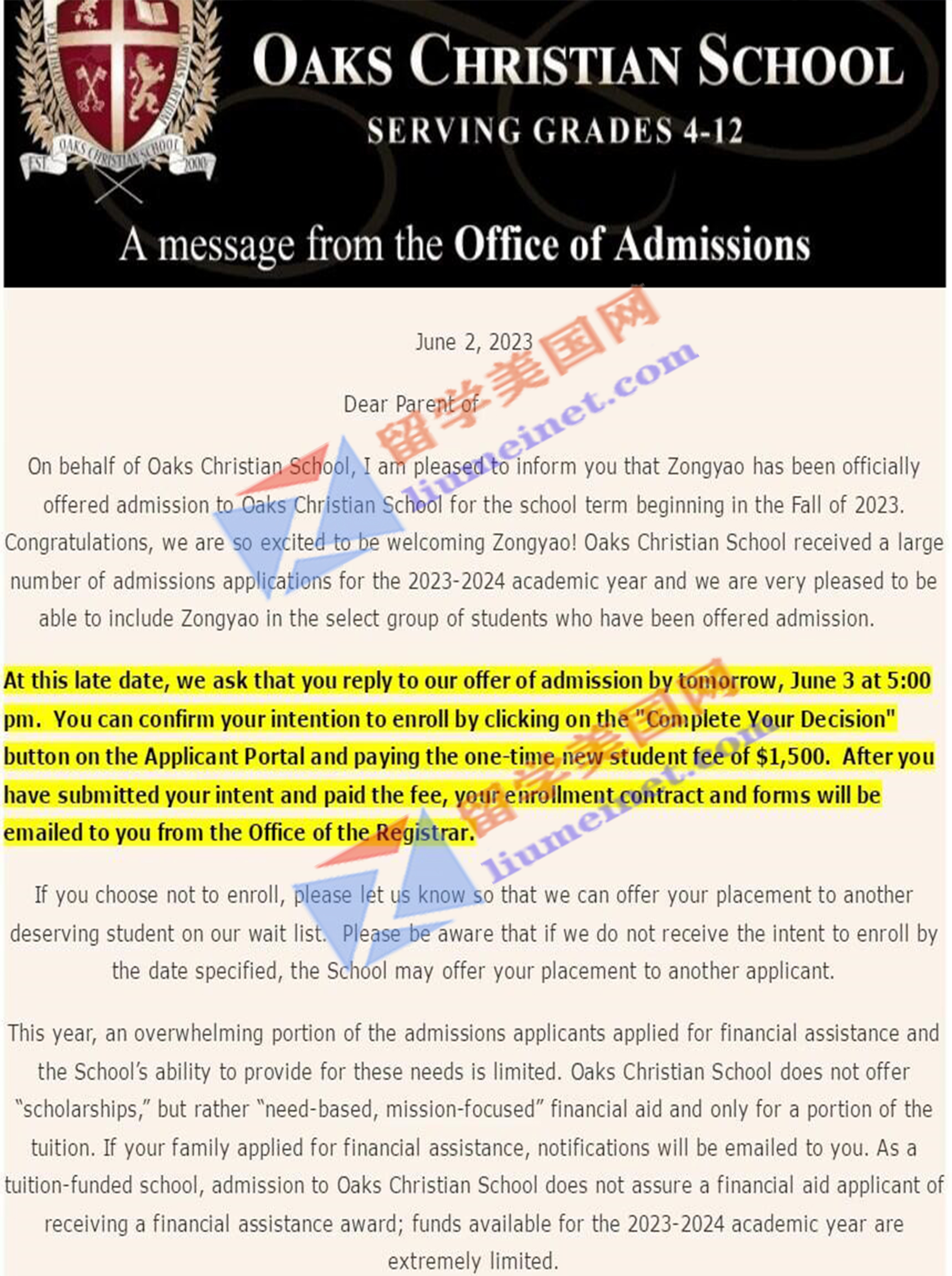 留美网喜报频传,恭喜留美网两位L同学(姐弟俩)斩获Oaks Christian School橡树基督学校的录取offer!