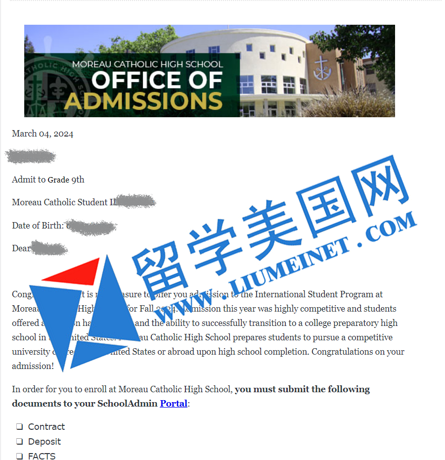 【录取喜报】恭喜留美网L同学收获Moreau Catholic High School 莫若天主教高中录取