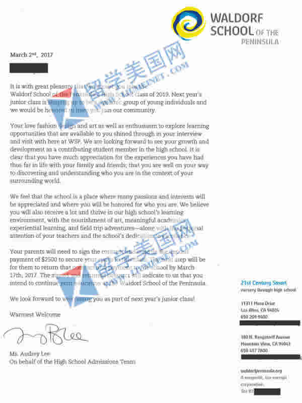 恭喜WXY同学获得Wardorf school of the Peninsula 半岛华道夫中学offer