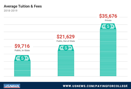 美国新闻数据显示,州内公立大学的平均学费和私立学院的平均学费比2018-2019学年的9,716美元低73%,而美国新闻数据显示为35,676美元。据美国新闻报道,737家私立大学的学费和收费数据显示,在美国新闻排名的私立大学中,超过100所私立大学在本学年的标价中收取至少50,000美元或以上的费用。