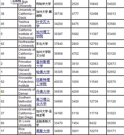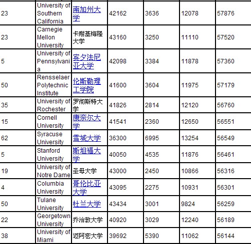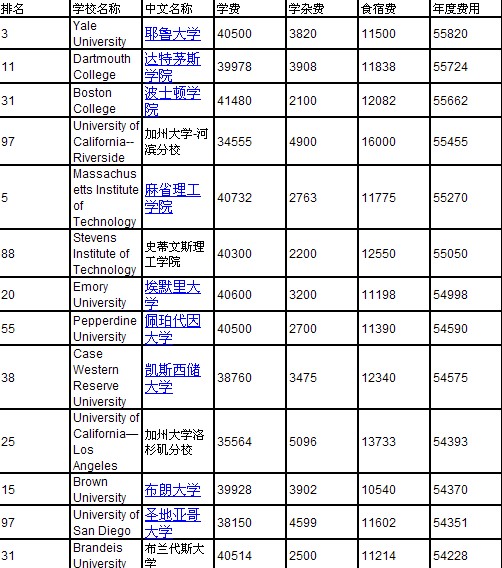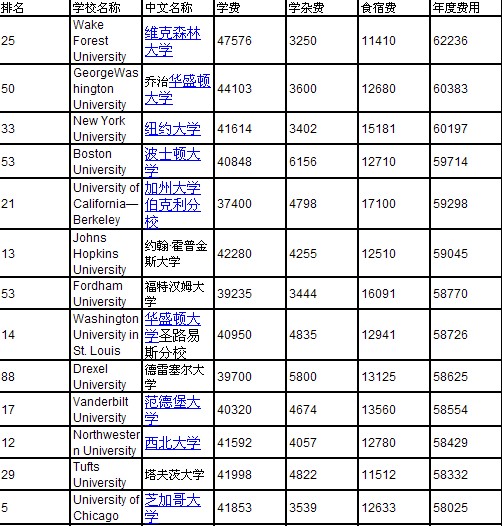 美国大学费用在$50,000-$56,000的学校及具体费用:(单位:美元/年)