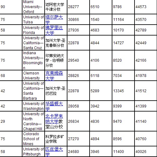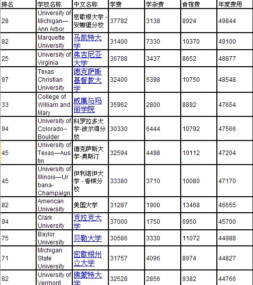 美国大学费用在$40,000-$50,000的学校及具体费用:(单位:美元/年)