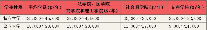 美国大学分为公立大学和私立大学。公立大学的收费一般低于私立大学。以下数据仅为学费,不包括书本费、生活费、杂费。
