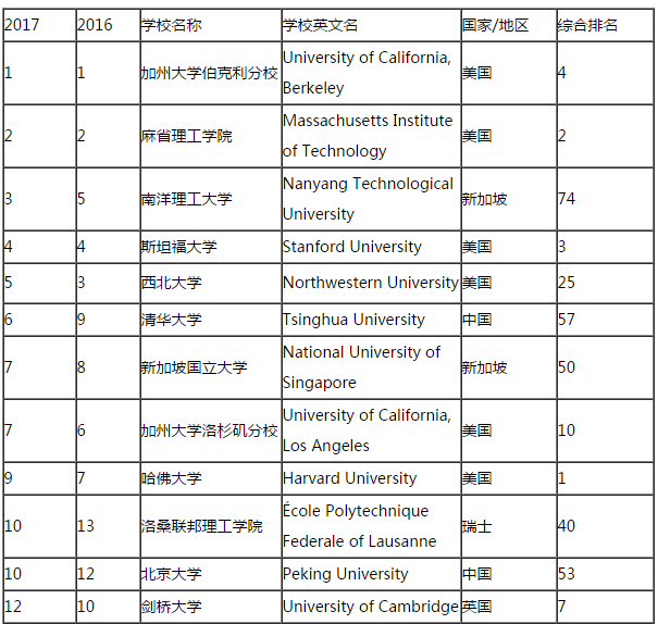 从近两年排名中对比分析可以看出,前十名的整体波动不是很大,尤其是加州大学伯克利分校和麻省理工学院连续两年位列第一名,北京大学和清华大学这次非常出彩,不但位列前十,较16年上升了两名。加州理工学院从24名上升到18名,算是本次排名中比较大的一个亮点,上升幅度比较大。