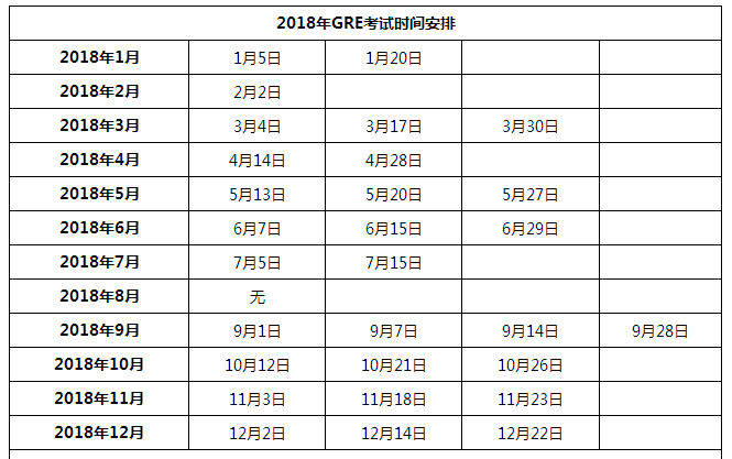2018年GRE考试时间汇总