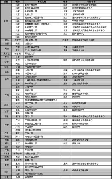 2013年GRE考试即将拉开序幕,对于准备2013年秋和2014年赴美国留学的广大学子开始准备考试了,考生要根据自己的留学计划,到GRE官网报名,选择考试的时间和地点。GRE全国考试考场分布表如下: