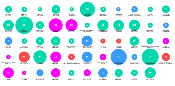 普林斯顿大学、哈佛大学、斯坦福大学、耶鲁大学、杜克大学、约翰斯·霍普金斯大学、西北大学、宾夕法尼亚大学、康奈尔大学、芝加哥大学、布朗大学、哥伦比亚大学、达特茅斯学院、加州大学洛杉矶分校、加州大学伯克利分校、圣母大学、莱斯大学、范德堡大学、密歇根大学、华盛顿大学(圣路易斯)、纽约大学、埃默里大学、南加州大学、波士顿学院、波士顿大学、布兰迪斯大学、乔治城大学、塔夫茨大学、杜兰大学、威斯康星大学、威廉姆斯学院、斯沃斯莫尔学院、波莫纳学院、阿默斯特学院、韦尔斯利学院、科尔盖特大学、科尔比学院、明德学院、汉密尔顿学院、肯扬学院、皮策学院、巴纳德学院、卫斯理大学、巴克内尔大学等