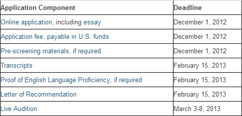 申请茱莉亚音乐学院一般除了基本材料和语言能力外,还要准备电子作品和面试。下面是2012-2013年的申请时间安排,同学们可以参考,2014年最新的要到9月份才会更新。