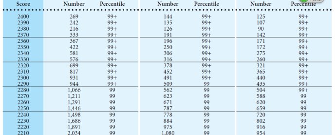 下面的图表是2007年的统计数字,可以看出,2007年全球一共有269个学生的满分,每年SAT在全球的考试是7次。平均起来每次有不到40人的满分。以150万个学生参加考试计算,考满分的比例是不到万分之二。下面的图表还列出了从2210 分到2400 分每个分数段的人数,以及男生和女生的人数。